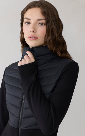 Stand out in the ANNICK by SOIA & KYO – a sustainable slim-fit, hip-length mixed media fleece jacket designed with a quilted puffy collar and upper front body made with a 100% recycled nylon shell. This unlined fall essential features sleek in-seam pockets as well as a high collar and rib cuffs with thumbholes designed to shield from cold winds. Your new go-to for stepping out in style or your next outdoor adventures.