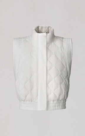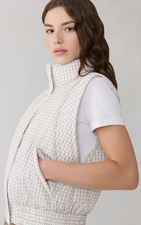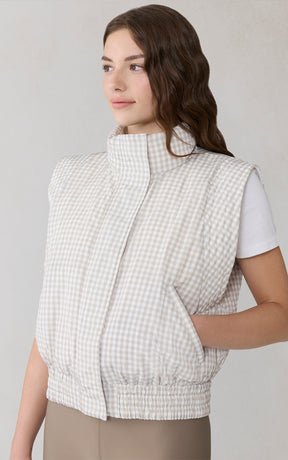 BRENNA by SOIA reimagines the bomber vest with a reversible gingham design. Lightly filled with RDS-certified down, it’s an easy, versatile piece for transitional layering—one side classic, the other quilted for subtle texture.