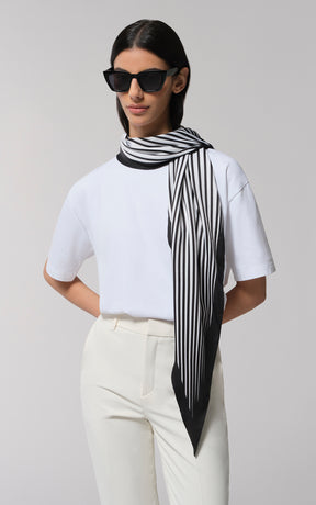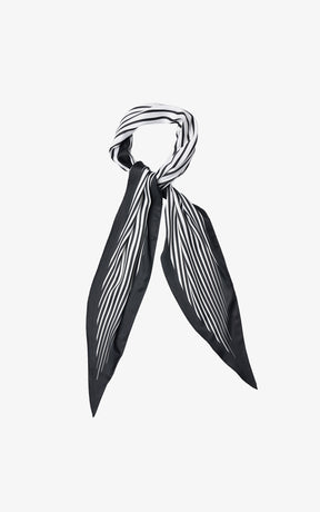 Add a little oomph and sophistication to your outfit with the DAISY by SOIA & KYO. This diamond-shaped scarf is very light, with narrow and long ends that make it easy to tie. Features a trendy black & white geometrical pattern.
