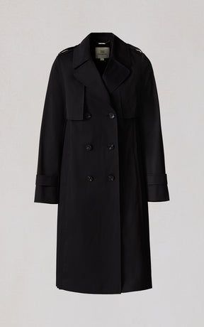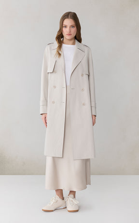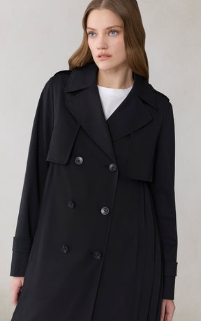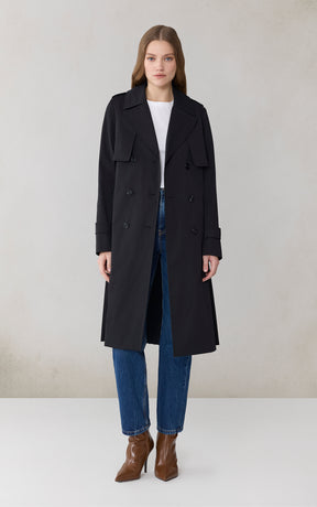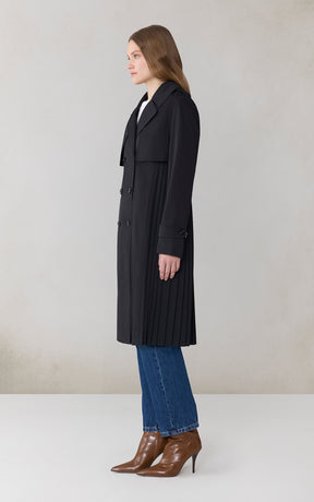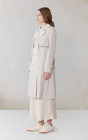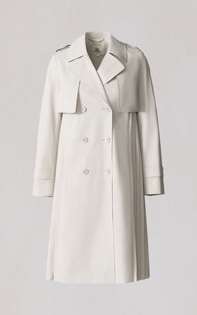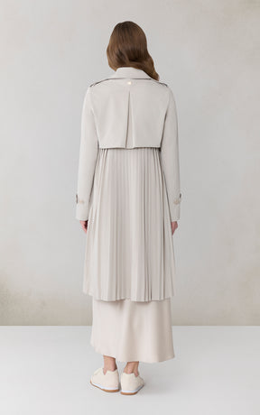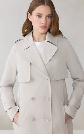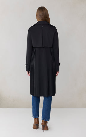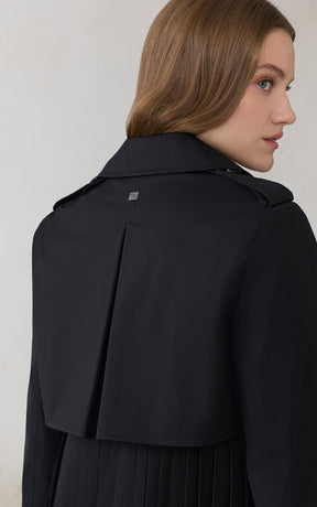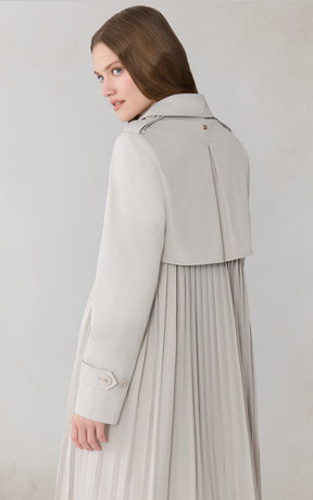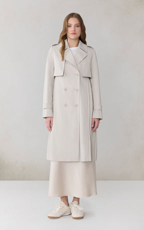 ELANOR by SOIA reimagines the trench with a permanent pleated panel that adds movement and modern dimension. Its relaxed silhouette, storm flap detailing, and weather-ready finish create a refined everyday layer.
