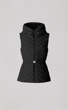 The ESTELLE-VEST by SOIA & KYO offers the same performance and polish as the original, reimagined in a sleeveless cut. Chevron quilting, a hood, and an elasticized belt ensure warmth and a flattering fit. Made with 4-way stretch down-proof fabric, it delivers comfort, mobility, and modern versatility—ideal for layering in shifting seasons.