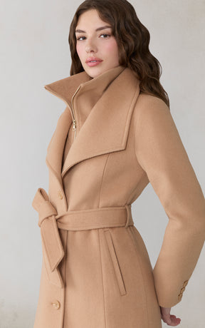 The ILANA-U by SOIA & KYO features a large lapel collar, detachable tie belt, and a bib with zipper closure for layered style. Angled welt pockets and full lining complete this calf-length coat crafted from a wool blend