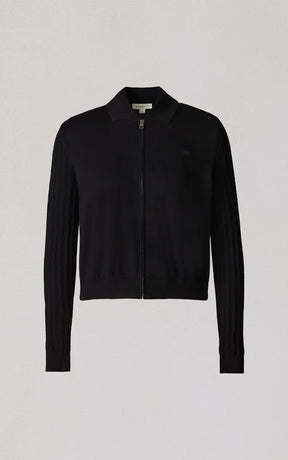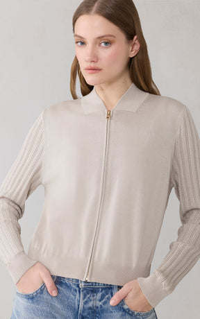 LORETTA by SOIA is a lightweight knit bomber blending silk and cotton for an airy, refined feel. With pointelle details and a ribbed trim, it’s a laid-back yet elevated piece that brings texture to your everyday look.